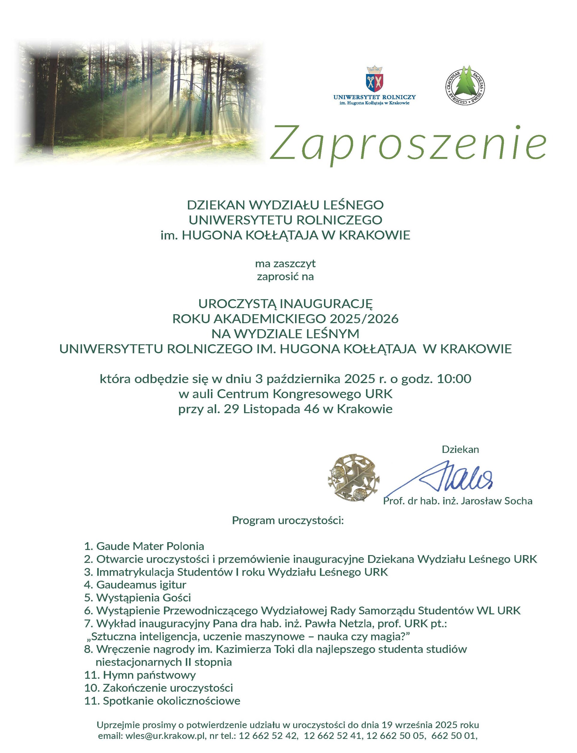 Dziekan Wydziału Leśnego Uniwersytetu Rolniczego im. Hugona Kołłątaja w Krakowie ma zaszczyt zaprosić na Uroczystą Inaugurację Roku Akademickiego 2025/2026 na Wydziale Leśnym Uniwersytetu Rolniczego im. Hugona Kołłątaja w Krakowie, która odbędzie się w dniu 3 października 2024 r. o godz. 10:00 w auli Centrum Kongresowego URK przy al. 29 Listopada 46 w Krakowie.
